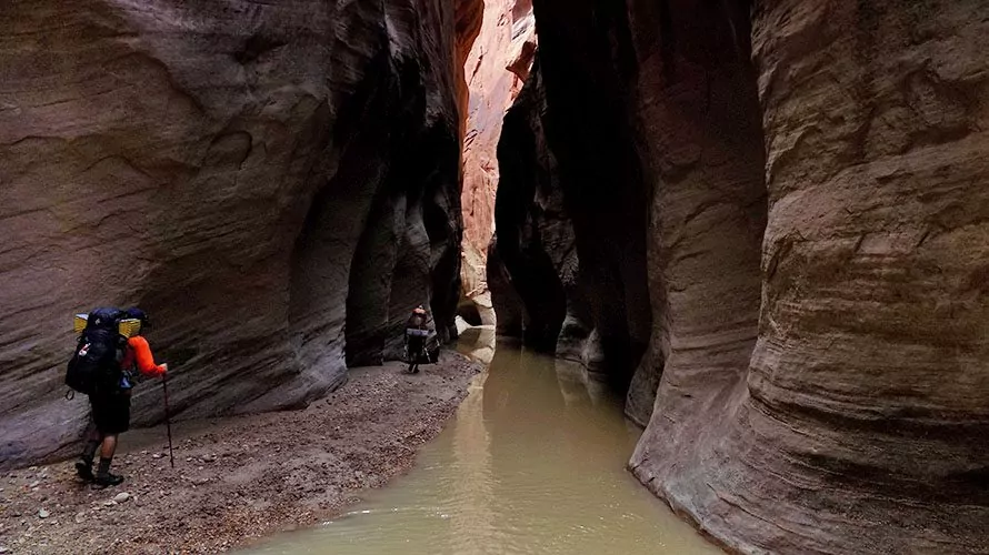 Significant mileage each day, often wading in ankle to calf deep water and stepping over boulders. The terrain is relatively flat and in some sections, your group will be able to move quickly on the packed sand. Other sections are slower and involve navigating small slippery boulders. There is no sanctioned trail as the trail is the canyon floor. The terrain can be altered by the conditions from day to day depending on flow levels of water in the canyon. There is one short (~4 strides-long) section of extreme exposure, where you must either walk along a narrow (~3 foot wide) section with a steep drop off on one side, or take an alternative off-trail bypass with some loose rock.