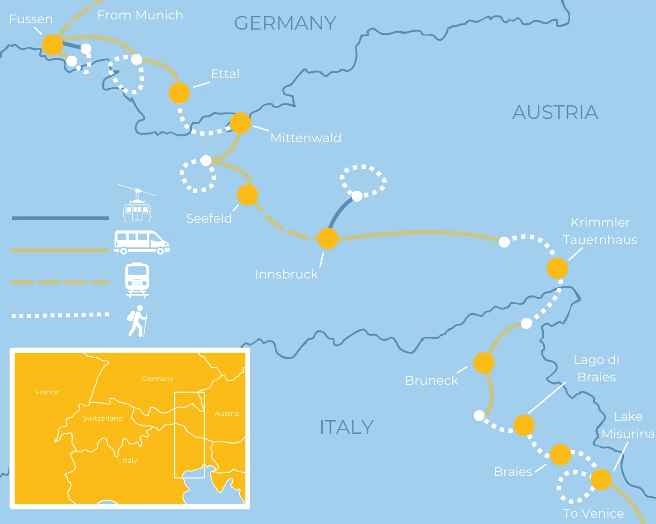 This unforgettable Alps trek takes you from Germany to Austria to Italy, crossing the spine of Europe’s most iconic mountain range. We’ll hike over high passes, past castles and waterfalls, and through charming alpine villages—all while carrying just a daypack, with luggage transferred most days. Evenings are spent enjoying regional cuisine and warm hospitality in storybook towns, while days are filled with breathtaking mountain views and rich cultural experiences. Beginning in Munich and ending in Venice, this trip blends world-class hiking with the magic of Europe’s great cities.