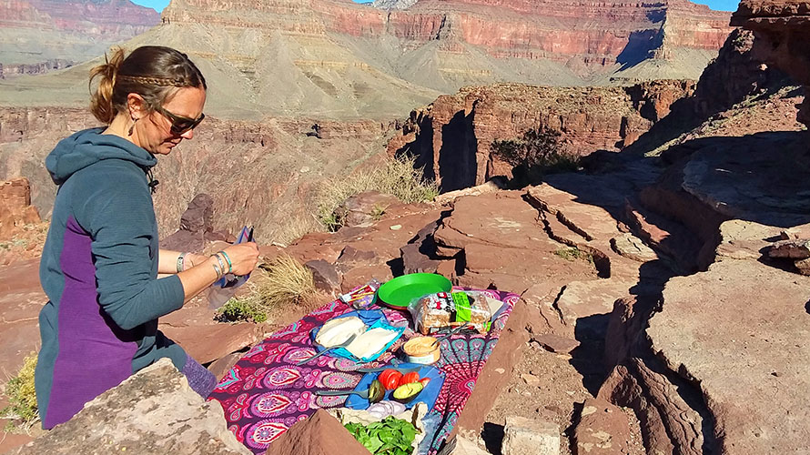 As you descend the sinuous trail into the depths of the Canyon, your guide will explain the miraculous geological and ecological phenomena that surround you. After either 1.5 miles or 3 miles (or anywhere in between – this is YOUR hike!) we will enjoy a delicious picnic lunch with a view better than any 5-star restaurant. Eventually we will start our return hike to the rim, this time staring up at the towering cliffs above us until we are finally standing back on top of them, gazing down in amazement at the wonderful journey we just took.
