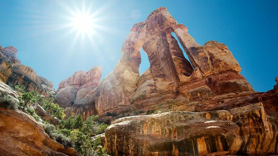 The morning begins with a departure from camp via the floor of a wide, beautiful canyon out to a remote and marvelous arch. Elephant Canyon is an endless delight of sandstone rock formations that enchant us as we make our way to the head of the canyon. The final section of the trail is a challenging, adventurous climb, first up a ladder, and then a scramble up a ravine to top us out onto a slickrock saddle. At the saddle, we see Druid Arch’s unique, angular and elongated double openings right in front of us! We will marvel at this arch and how it came to be before making our way back to camp for a wonderful dinner, relaxing evening and great night’s sleep.