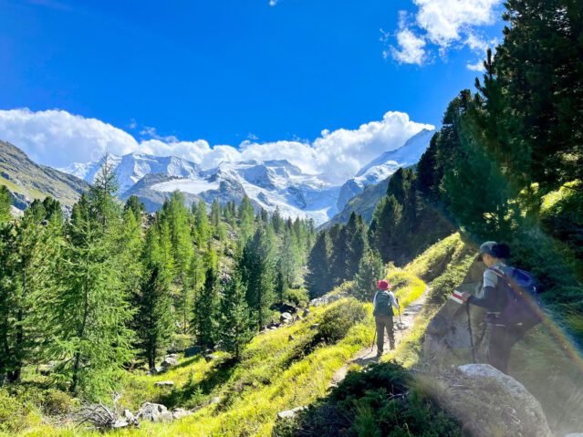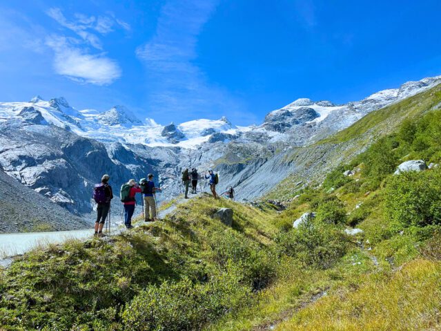 Today’s hike might be our trip’s longest but is one of the most rewarding for our effort. Leaving from our lodge, our trail today takes us to the isolated far end of the Roseg Valley near to the Coaz Refuge. As we climb up the valley, we’ll pass by the green waters of Vadret Lake. As we climb, we’ll have stunning views of the towering peaks of Piz Glüschaint, Piz Roseg, Piz Bernina and the Bernina Glaciers. On our return, we pass by rushing waterfalls and meandering creek tributaries spread out on the valley’s floor.