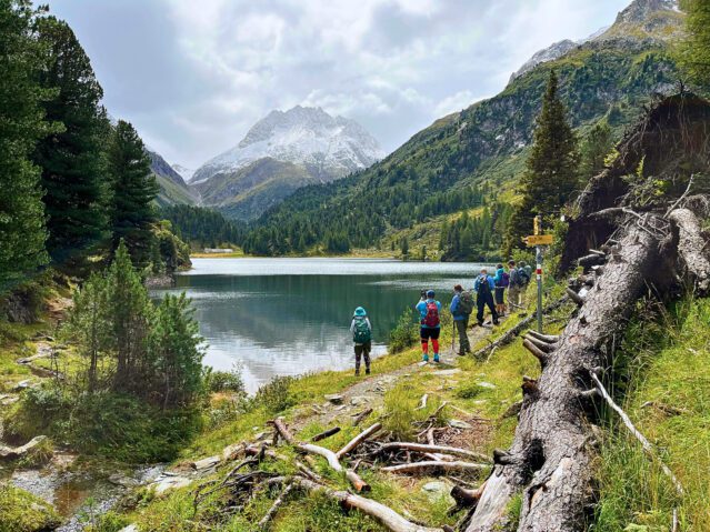 After our first Swiss breakfast spread, we take a short transfer by bus to the village of Maloja. Here we’ll begin our first hike into the surrounding mountains. Our loop starts at the base of Piz Salecina and climbs into the valley beneath this peak. After crossing the valley’s waterway we’ll climb up toward our first of two lakes, Cavloc Lake. Here we are surrounded by high mountain peaks reflecting off its pristine blue water.After enjoying the lake we’ll continue up the valley a ways before turning back toward the lake and finishing our loop. The second half of our hike takes us around the base of Salecina and allows more sweeping views of the nearby mountain ranges. After passing another lake we’ll start our descent towards town with the iconic ringing of cowbells surrounding us. A short bus brings us back to our hotel, where deserved hot showers and another fabulous dinner together await our arrival.