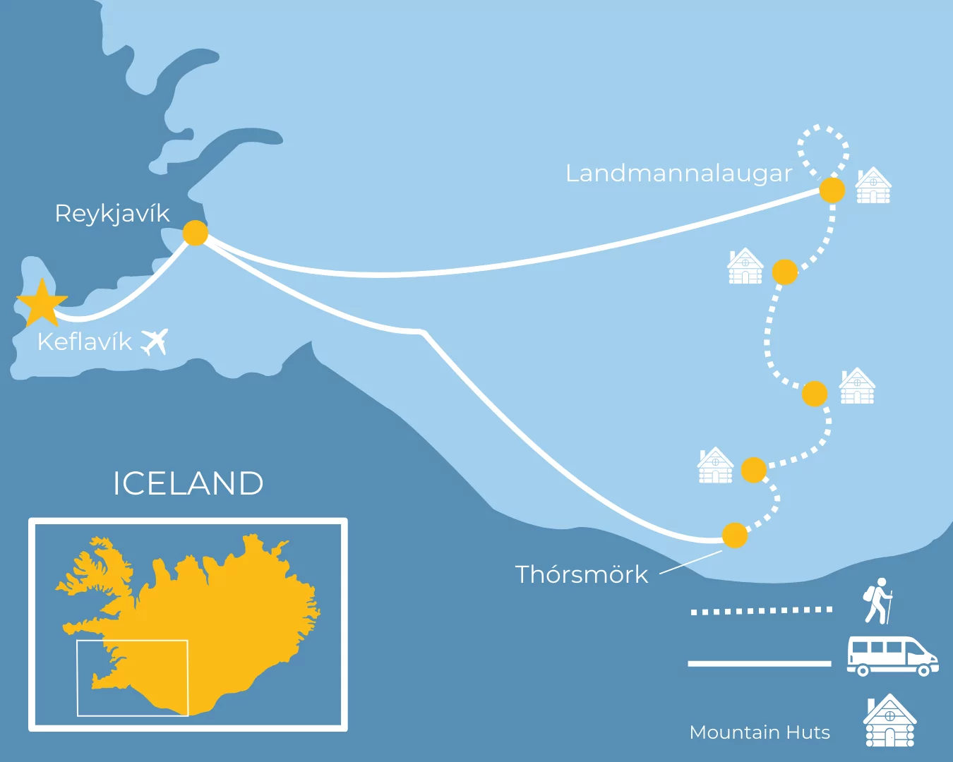 Lodging for the duration of the tour including hotel in Reykjavík and mountain huts during the trek
