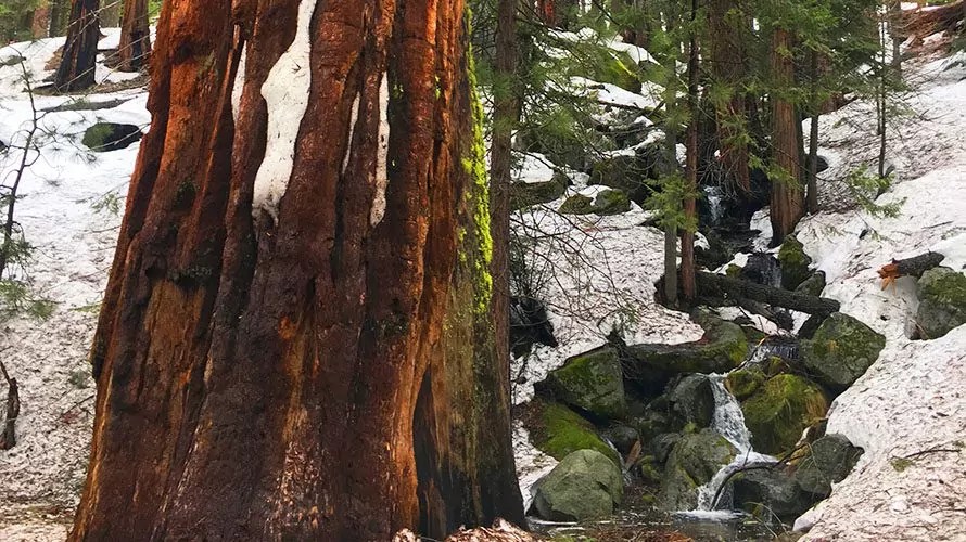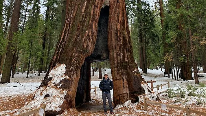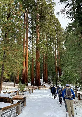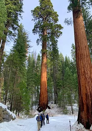 This Yosemite winter trek begins off of Highway 41 near Yosemite Entrance station at the Mariposa Grove trailhead. In the wintertime the road to the grove is closed adding 2 miles to our summer trek. After a hot cup of tea, hot chocolate or coffee with your guide we will begin our ascent toward the Giant Sequoia Grove. We will begin at the road closure and hike/snowshoe up the unplowed road toward the grove. The trail begins on the south end of the grove and heads west passing the “Fallen Monarch” and the “Bachelor and Three Graces” within the first mile. Continuing on another ¼ mile and a 300ft gain in elevation we will arrive at the Grizzly Giant. This is the tallest, 209 ft, and oldest tree in Yosemite national park. Continuing on, the trail climbs steadily as we hike past many other massive Sequoia’s namely the “Faithful couple” and the aptly named “Clothespin” tree. Continuing on past the “Mariposa” tree we climb into the Upper Grove at 6,800ft to have a trail lunch at the “Galen Clark” tree. After lunch we will take a small loop back toward the road past two more Giant Sequoia’s the “Fallen Wawona Tunnel” tree and the “Telescope” tree. Descending back on our previous tracks we will make our way back where we came from, down the road and safely back to our cars.