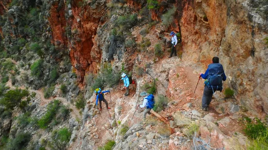 This trip is Level 4. The way up is on a steep, very rugged, unmaintained trail that at times requires the use of arms. It has significant heights exposure in places and may require hiking in 105+ degree fahrenheit temperatures (May-Sept).