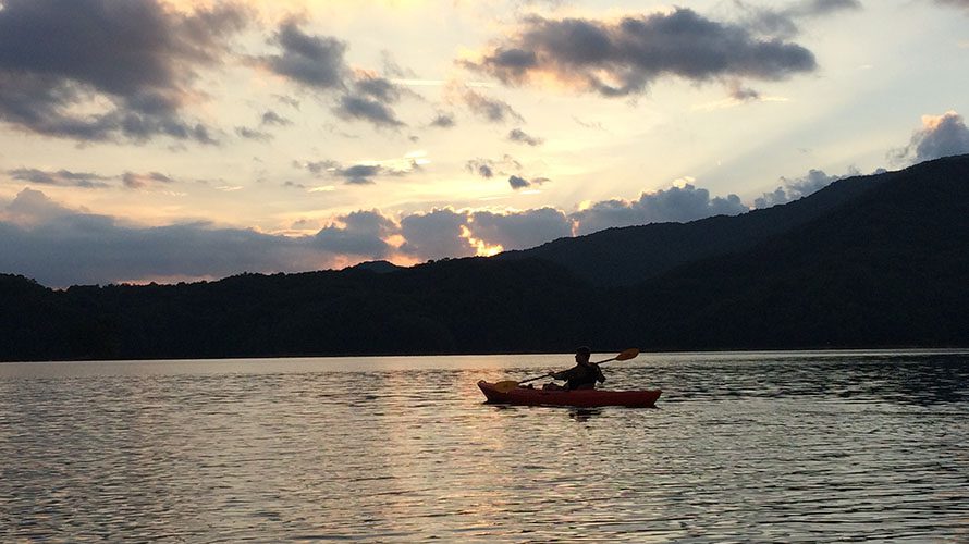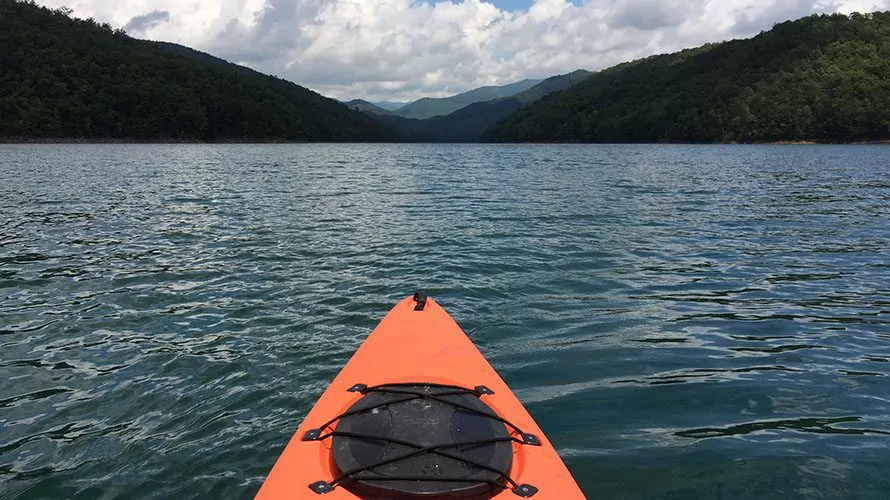This day of flat-water paddling and mountain hiking in amazing Great Smoky Mountains National Park gives you the best of both worlds – water and land . Our multi-sport adventure starts with a scenic drive from Asheville, NC to Fontana Lake (including pick up at your hotel in Asheville, or we can rendezvous at the lake). This tour has two options, with significant variation in difficult and level of adventure between the two. Both feature majestic paddling across a pristine lake with breathtaking views of the towering, forested mountains around us.