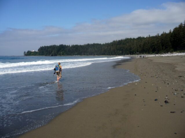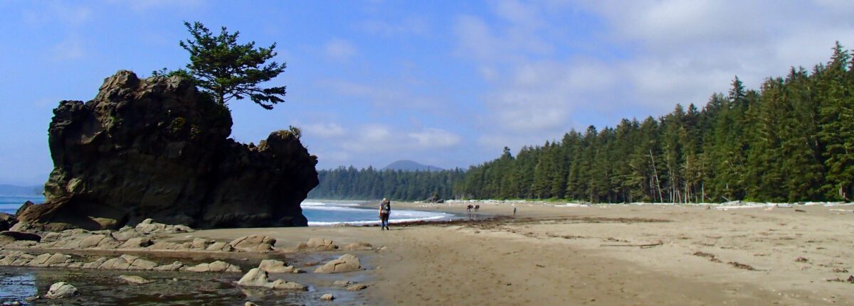 Today might be the longest hike we have, and it is filled with rewards and trail side treasures along the way. After a morning of beach walking with killer views and maybe even killer whales, we’ll reach the local crab shack at Nitinat Narrows to have lunch. Soon after we’ll take our second boat ferry of the trip and continue our hike towards Tsusiat Point and the unique “Hole in the Wall” feature there. Our day ends at maybe the most popular camps along our route, Tsusiat Falls. Here a waterfall comes right down on the beach and creates a great pool for some fresh water swimming!