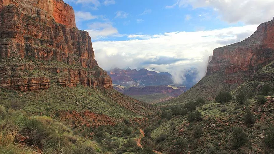 Our Winter Rim to Rim to Rim hiking tour is a rare opportunity to hike the Grand Canyon’s most famous trails, see both rims in winter, and experience the amazingly diverse micro-climates in the Canyon, all while having it nearly all to yourself. We begin and end on the South Rim, crossing the Colorado River near Phantom Ranch, and continue up to a high camp where we day hike to the North Rim. And we see desert oases, geological phenomena, Native American ruins, box canyons and more en route!