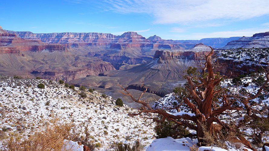 Our Winter Rim to Rim to Rim hiking tour is a rare opportunity to hike the Grand Canyon’s most famous trails, see both rims in winter, and experience the amazingly diverse micro-climates in the Canyon, all while having it nearly all to yourself. We begin and end on the South Rim, crossing the Colorado River near Phantom Ranch, and continue up to a high camp where we day hike to the North Rim. And we see desert oases, geological phenomena, Native American ruins, box canyons and more en route!